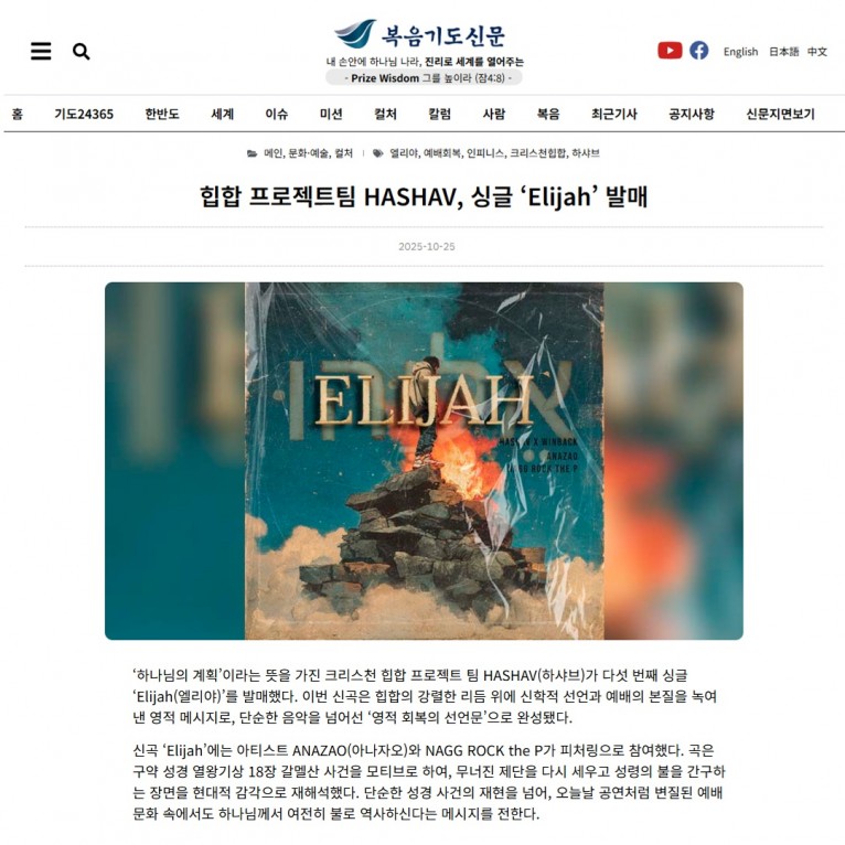 뮤직타임 [기사] 힙합 프로젝트팀 HASHAV, 싱글 ‘Elijah’ 발매(복음기도신문)