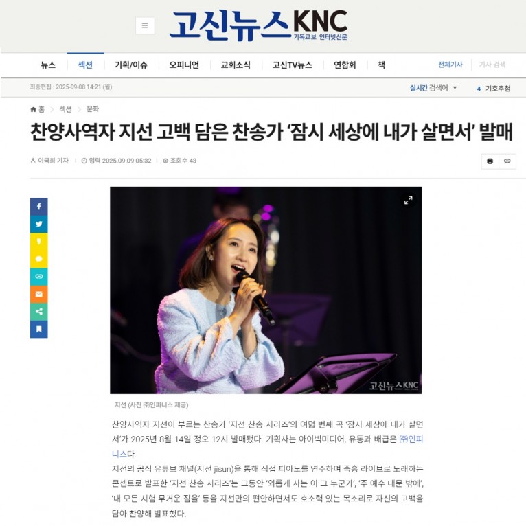 뮤직타임 [기사] 찬양사역자 지선 고백 담은 찬송가 ‘잠시 세상에 내가 살면서’ 발매(고신뉴스 KNC)