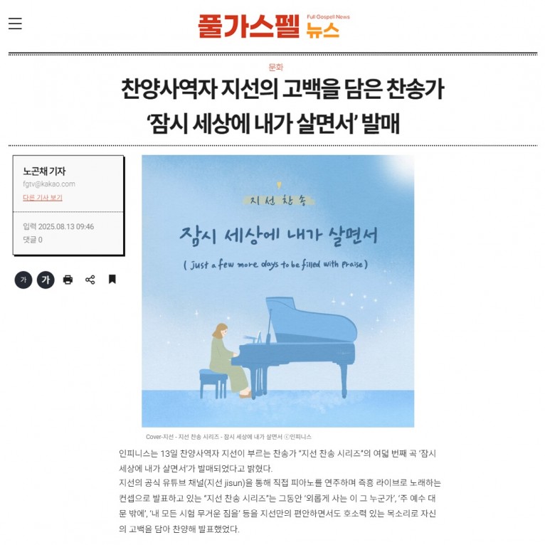 [기사] 찬양사역자 지선의 고백을 담은 찬송가 ‘잠시 세상에 내가 살면서’ 발매(풀가스펠뉴스)