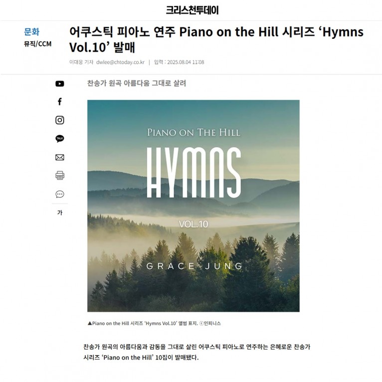 [기사] 어쿠스틱 피아노 연주 Piano on the Hill 시리즈 ‘Hymns Vol.10’ 발매(크리스천투데이)