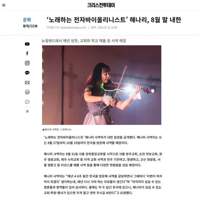 뮤직타임 [기사] ‘노래하는 전자바이올리니스트’ 해나리, 8월 말 내한(크리스천투데이)