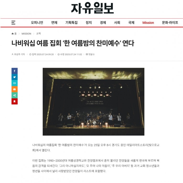 뮤직타임 [기사] 나비워십 여름 집회 ‘한 여름밤의 찬미예수’ 연다(자유일보)