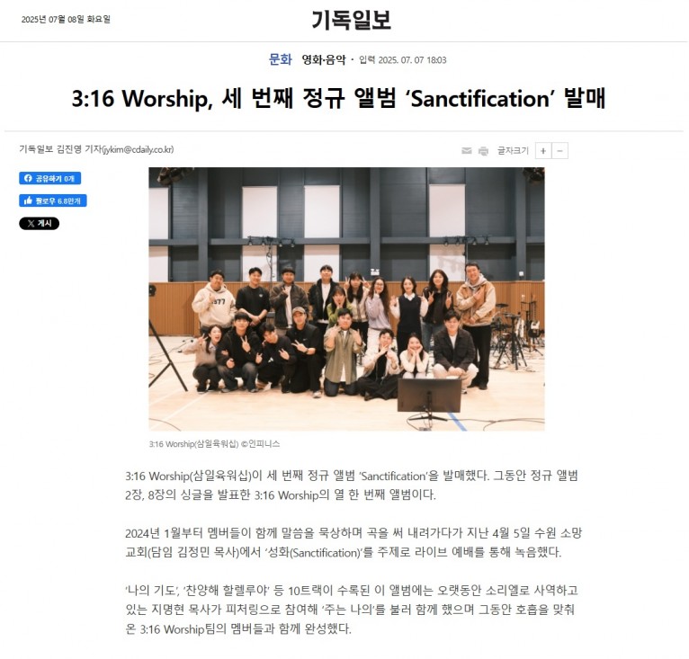 [기사] 3:16 Worship, 세 번째 정규 앨범 ‘Sanctification’ 발매(기독일보)