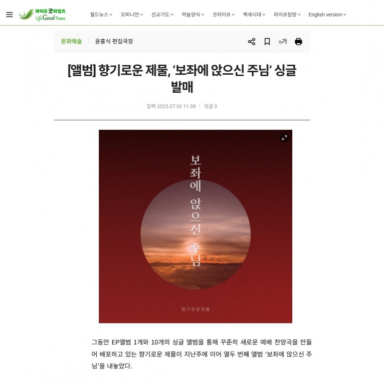 [기사] 향기로운 제물, ‘보좌에 앉으신 주님’ 싱글 발매(라이프굿타임즈)