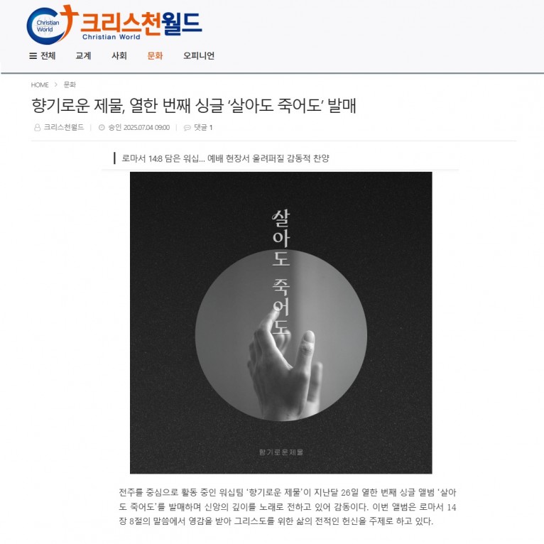 [기사] 향기로운 제물, 열한 번째 싱글 ‘살아도 죽어도’ 발매(크리스천월드)