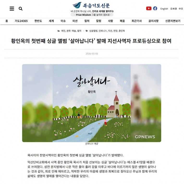 [기사] 황인옥의 첫번째 싱글 앨범 ‘살아납니다’ 발매 지선사역자 프로듀싱으로 참여(복음기도신문)