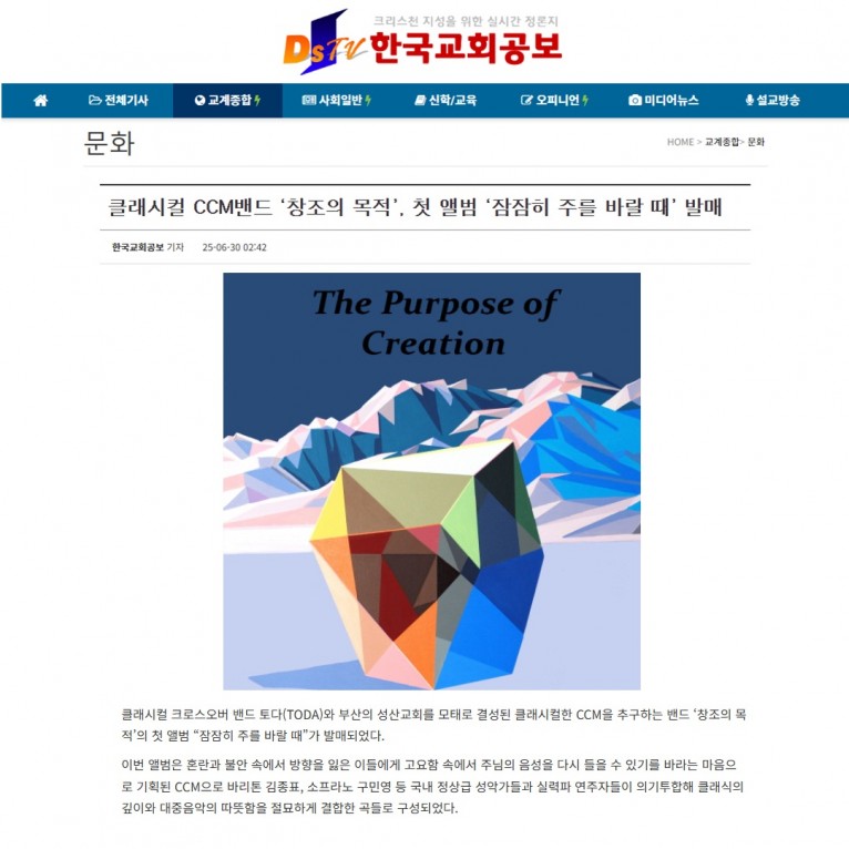 클래시컬 크로스오버 밴드 토다(TODA)와 부산의 성산교회를 모태로 결성된 클래시컬한 CCM을 추구하는 밴드 ‘창조의 목적’의 첫 앨범 “잠잠히 주를 바랄 때”가 발매되었다.