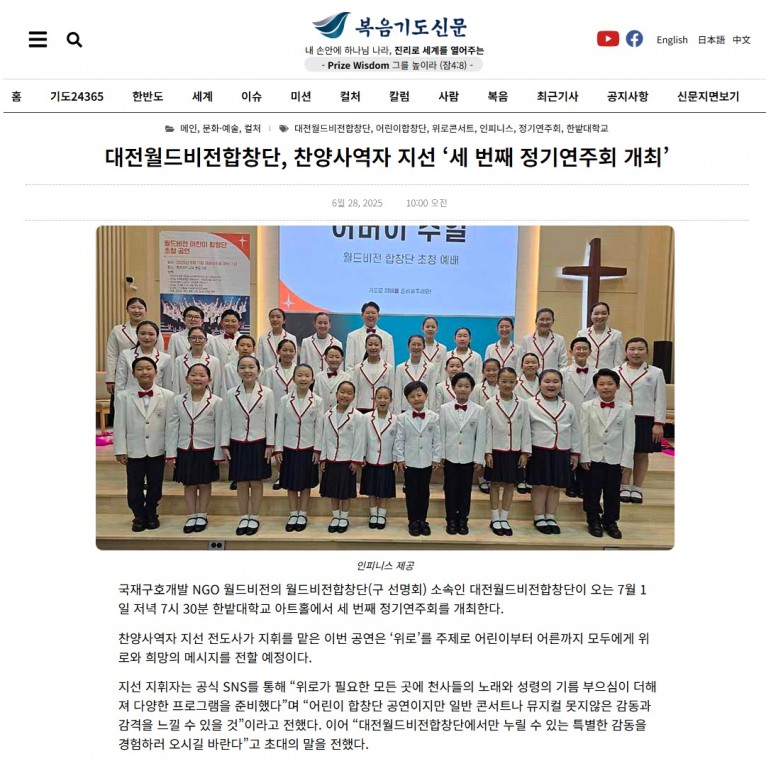 뮤직타임 [기사] 대전월드비전합창단, 찬양사역자 지선 ‘세 번째 정기연주회 개최’(복음기도신문)