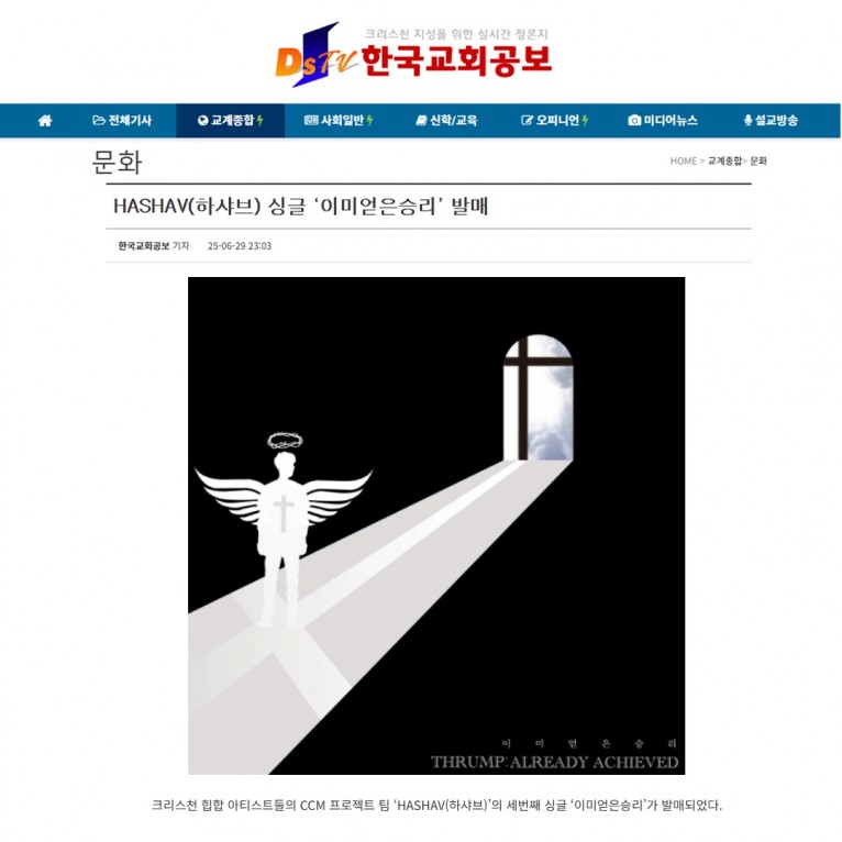 뮤직타임 [기사] HASHAV(하샤브) 싱글 ‘이미얻은승리’ 발매(한국교회공보)