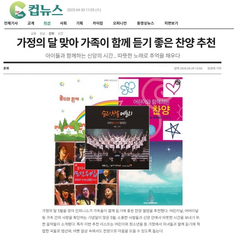 뮤직타임 [기획기사] 가정의 달 맞아 가족이 함께 듣기 좋은 찬양 추천(크리스챤연합신문 컵뉴스)
