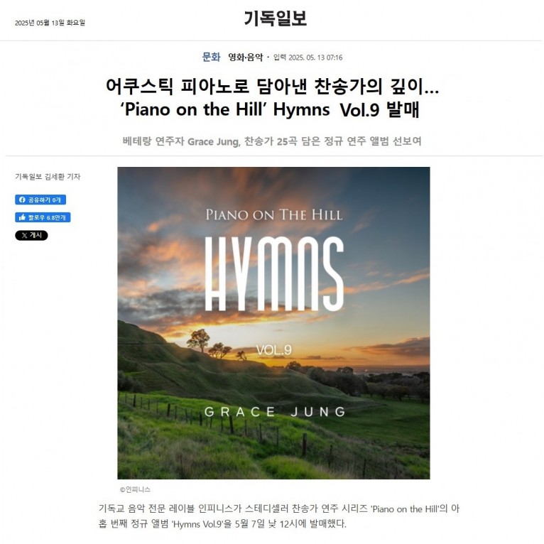[기사] 어쿠스틱 피아노로 담아낸 찬송가의 깊이… ‘Piano on the Hill’ Hymns Vol.9 발매(기독일보)