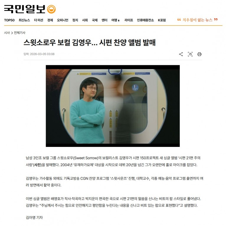 뮤직타임 [기사] 스윗소로우 보컬 김영우… 시편 찬양 앨범 발매(국민일보)