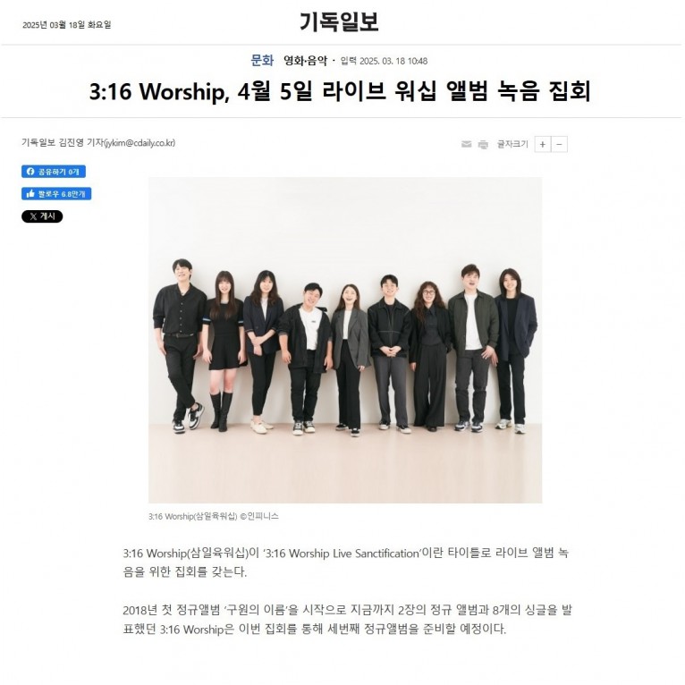 [기사] 3:16 Worship, 4월 5일 라이브 워십 앨범 녹음 집회(기독일보)