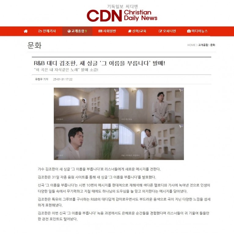 뮤직타임 [기사] R&B 대디 김조한, 새 싱글 ‘그 이름을 부릅니다’ 발매!(기독일보 씨디엔)
