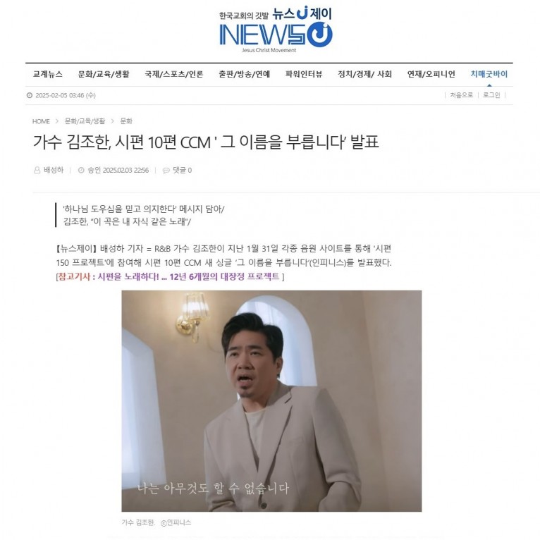[기사] 가수 김조한, 시편 10편 CCM ' 그 이름을 부릅니다’ 발표(뉴스제이)