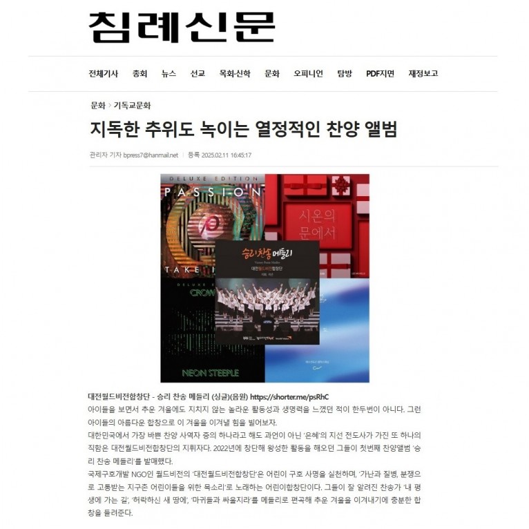 뮤직타임 [기획기사] 지독한 추위도 녹이는 열정적인 찬양 앨범(침례신문)