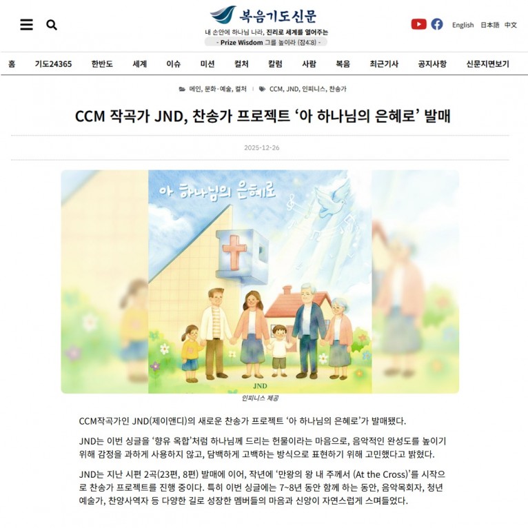 [기사] CCM 작곡가 JND, 찬송가 프로젝트 ‘아 하나님의 은혜로’ 발매(복음기도신문)