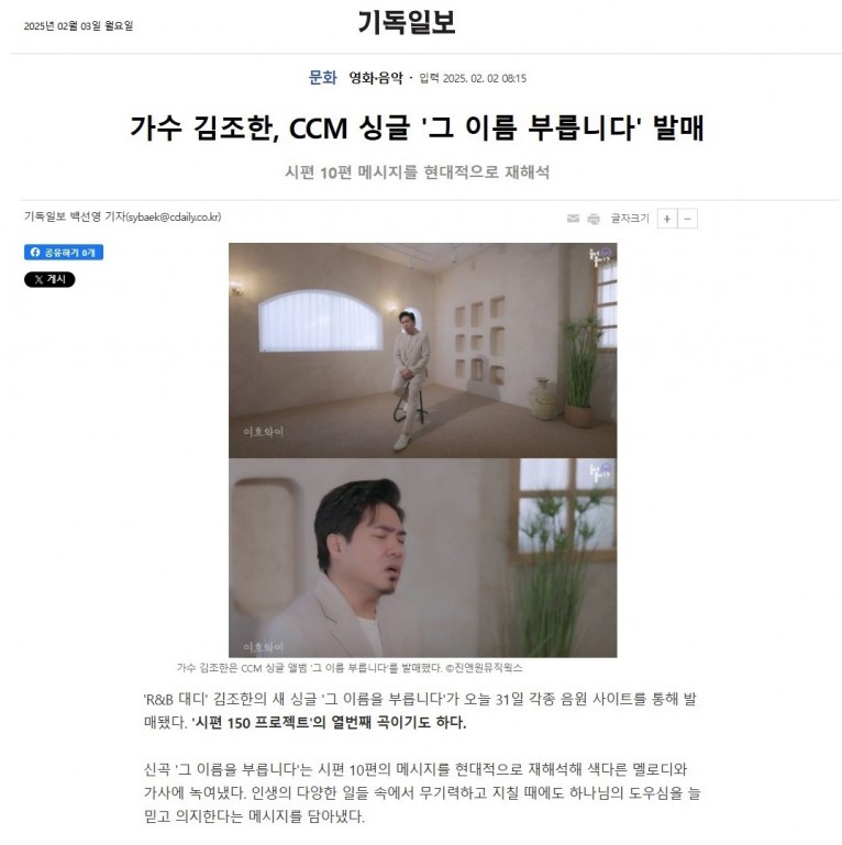 [기사] 가수 김조한, CCM 싱글 '그 이름 부릅니다' 발매(기독일보)