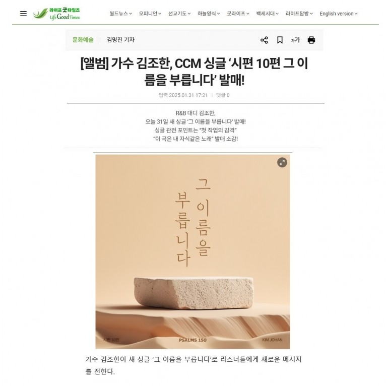 [기사] 가수 김조한, CCM 싱글 ‘시편 10편 그 이름을 부릅니다’ 발매!(라이프굿타임즈)