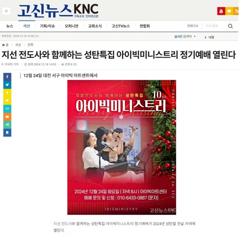 뮤직타임 [기사] 지선 전도사와 함께하는 성탄특집 아이빅미니스트리 정기예배 열린다(고신뉴스 KNC)