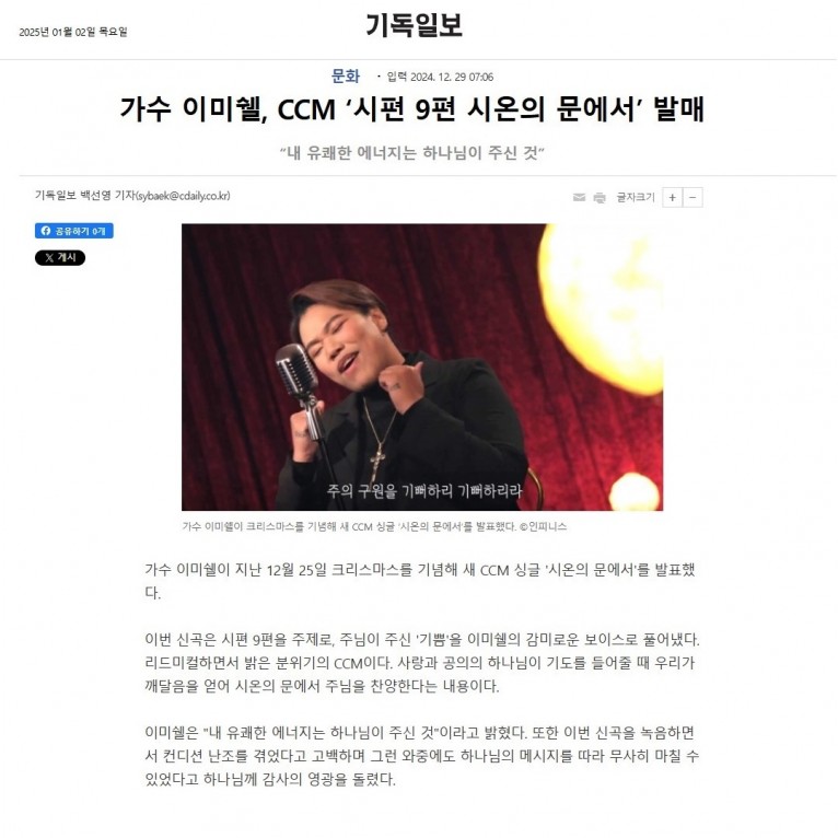 [기사] 가수 이미쉘, CCM ‘시편 9편 시온의 문에서’ 발매(기독일보)