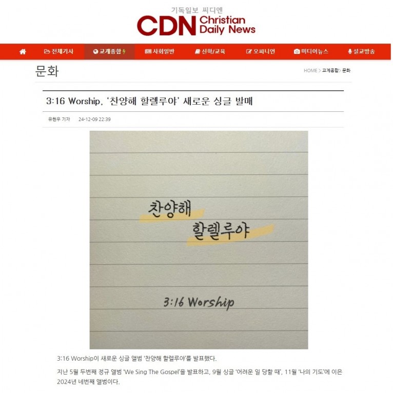 뮤직타임 [기사] 3:16 Worship, ‘찬양해 할렐루야’ 새로운 싱글 발매(기독일보 씨디엔)