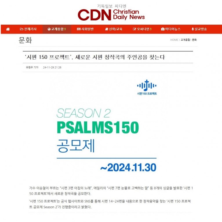[기사] ‘시편 150 프로젝트’, 새로운 시편 창작곡의 주인공을 찾는다(기독일보 씨디엔)