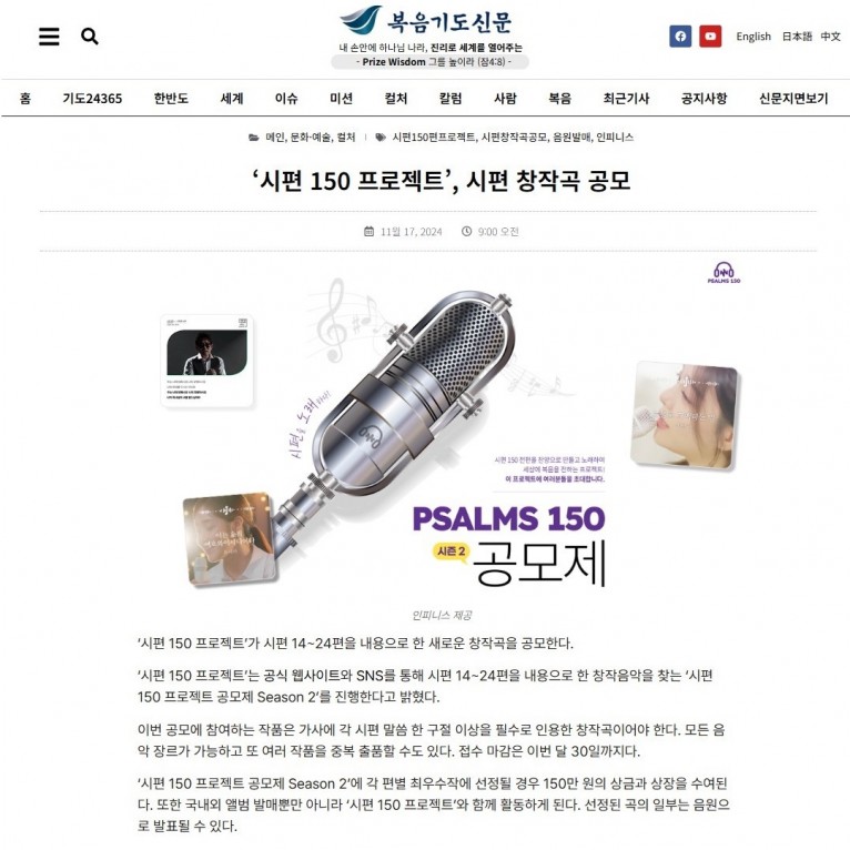 [기사] ‘시편 150 프로젝트’, 시편 창작곡 공모(복음기도신문)