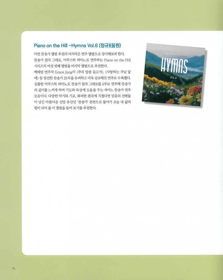 찬송가 원곡 그대로, 어쿠스틱 피아노로 연주하는 Piano on the Hill 시리즈의 여섯 번째 앨범을 마지막 앨범으로 추천한다.