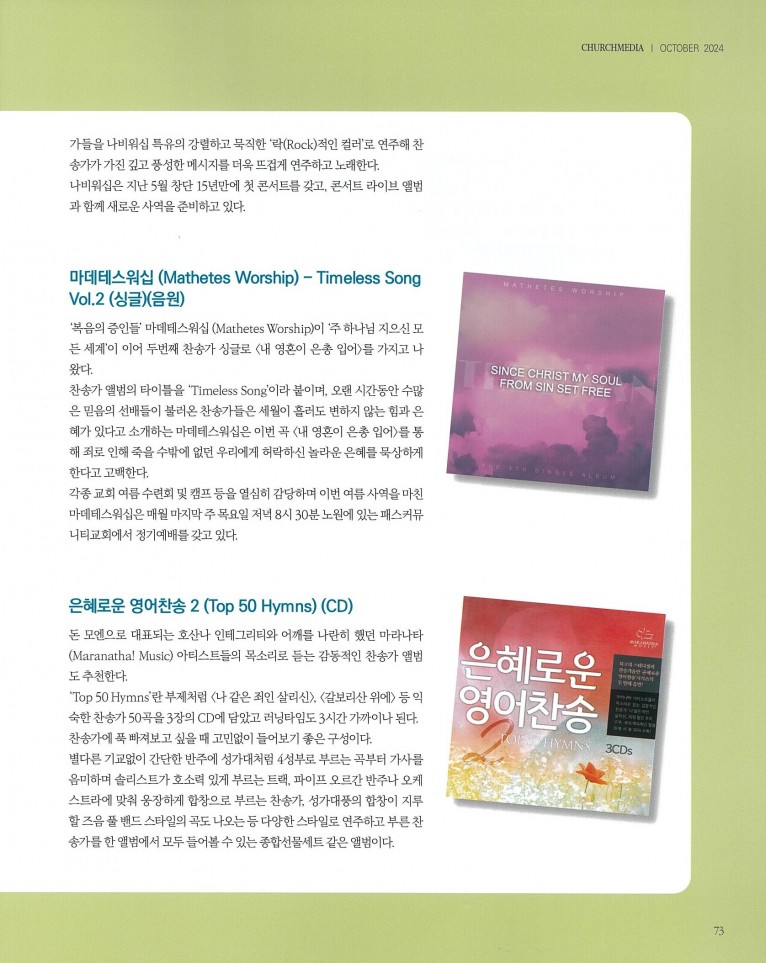 뮤직타임 [잡지] 믿음의 선배들이 남긴 아름다운 신앙 유산 찬송가 앨범 추천(월간 Church Media 2024.10월호)