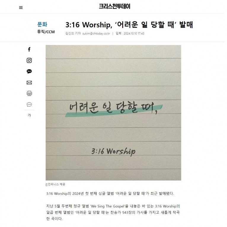 [기사] 3:16 Worship, ‘어려운 일 당할 때’ 발매(크리스천투데이)