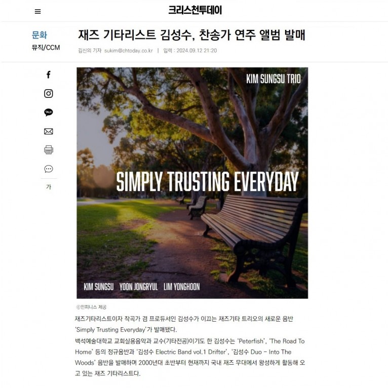 재즈기타리스트이자 작곡가 겸 프로듀서인 김성수가 이끄는 재즈기타 트리오의 새로운 음반 ‘Simply Trusting Everyday’가 발매됐다.