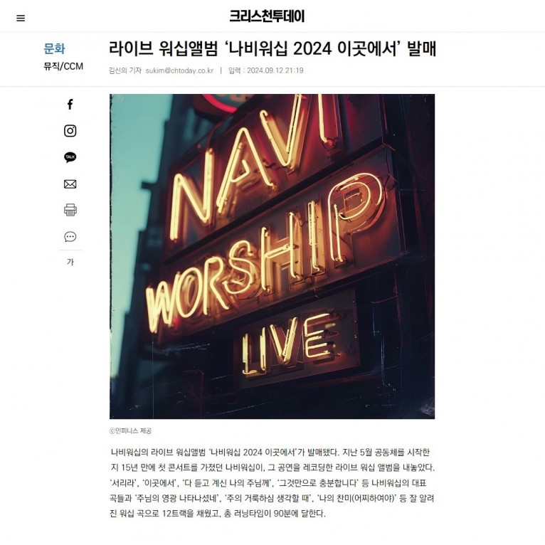 뮤직타임 [기사] 라이브 워십앨범 ‘나비워십 2024 이곳에서’ 발매 (크리스천투데이)