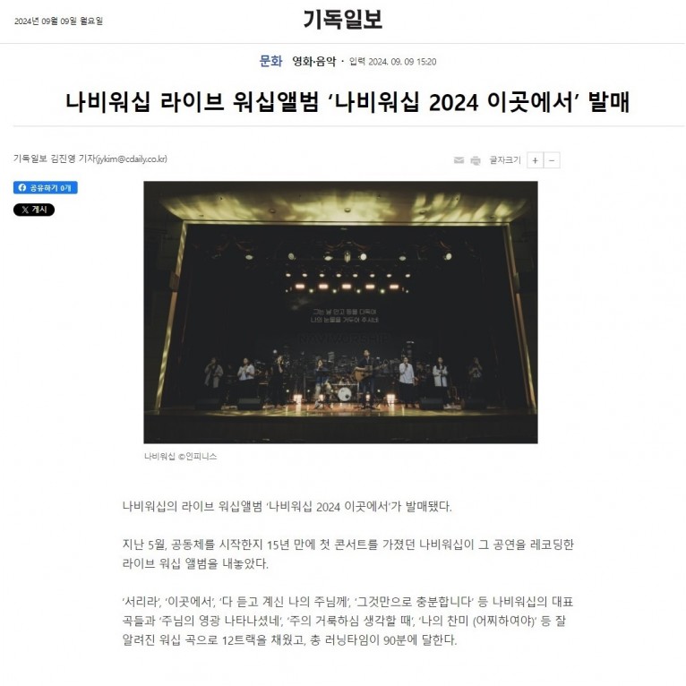 뮤직타임 [기사] 나비워십 라이브 워십앨범 ‘나비워십 2024 이곳에서’ 발매(기독일보)