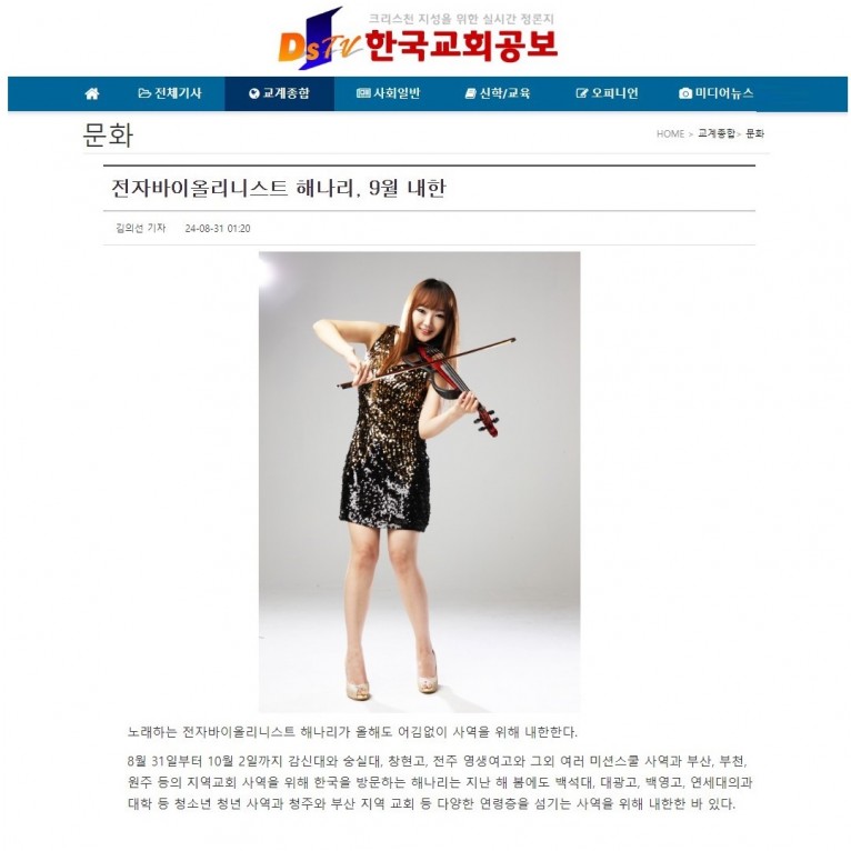 [기사] 전자바이올리니스트 해나리, 9월 내한(한국교회공보)