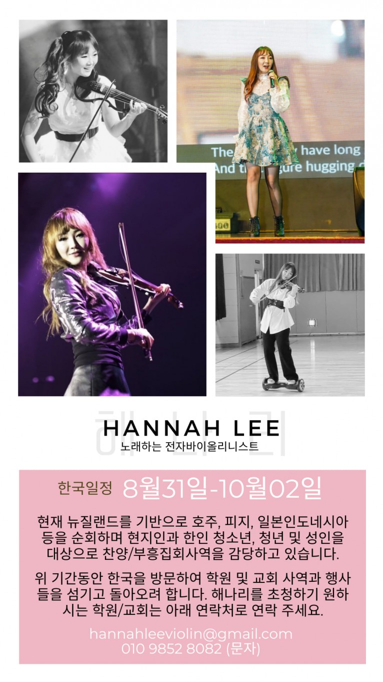 이번 내한기간동안 사역을 원하는 교회, 학교, 방송사 등은 hannahleeviolin@gmail.com , 010-9852-8082(문자)로 문의하면 된다.