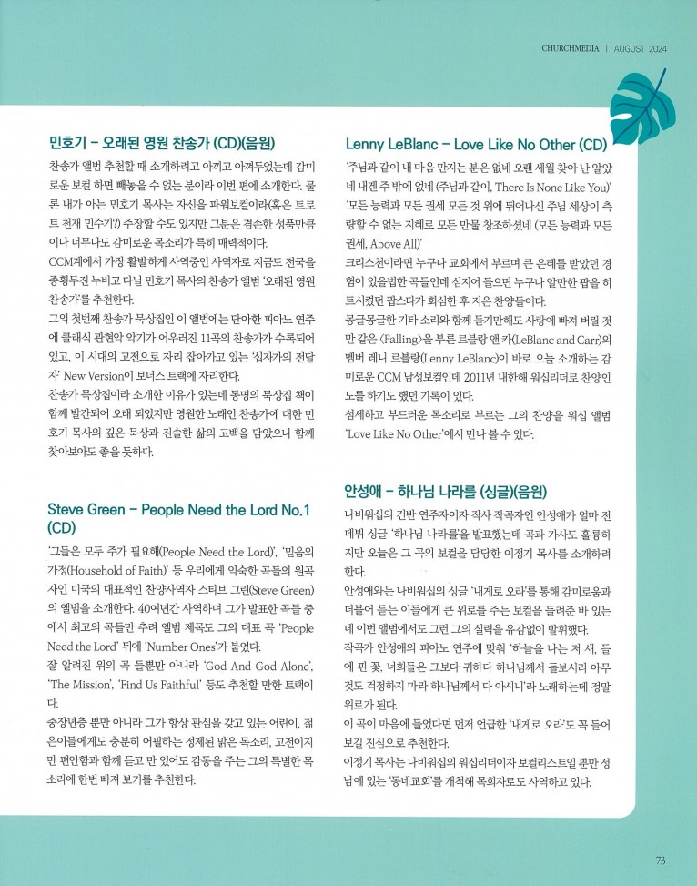 [잡지] 감미로운 남성보컬로 듣는 CCM 앨범 추천(월간 Church Media 2024.8월호)
