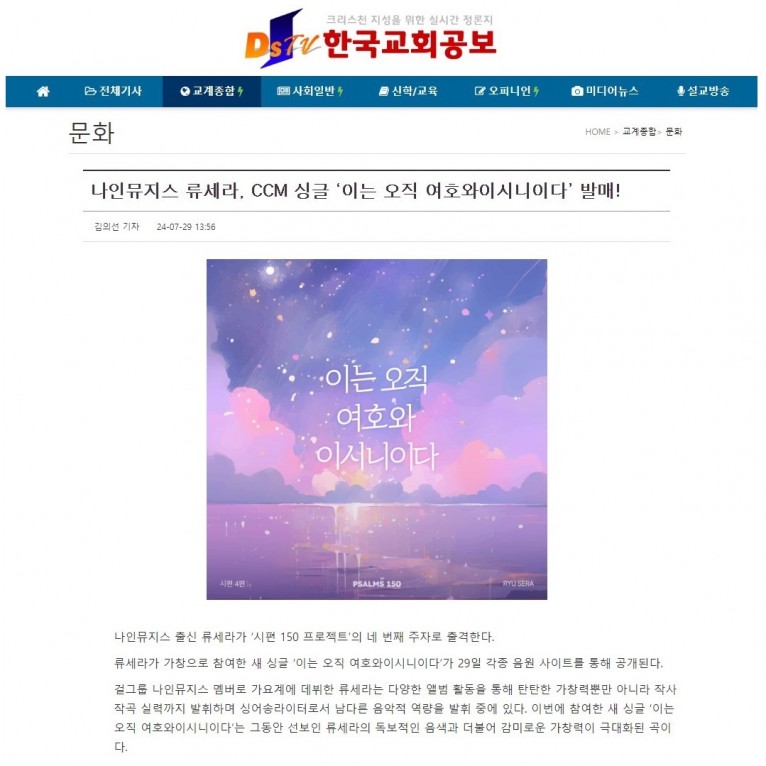 뮤직타임 [기사] 나인뮤지스 류세라, CCM 싱글 ‘이는 오직 여호와이시니이다’ 발매!(한국교회공보)