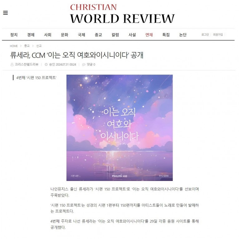 뮤직타임 [기사] 류세라, CCM ‘이는 오직 여호와이시니이다’ 공개(크리스챤월드리뷰)