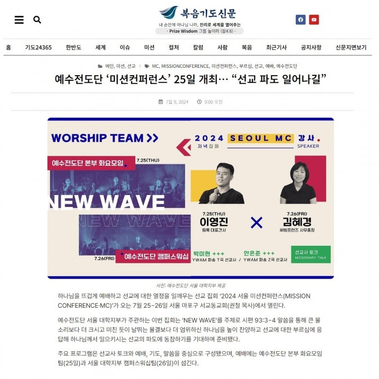 뮤직타임 [기사] 예수전도단 ‘미션컨퍼런스’ 25일 개최… “선교 파도 일어나길”(복음기도신문)