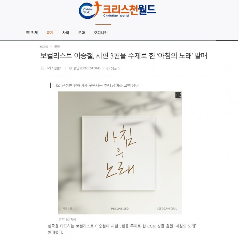 [기사] 보컬리스트 이승철, 시편 3편을 주제로 한 ‘아침의 노래’ 발매(크리스천월드)