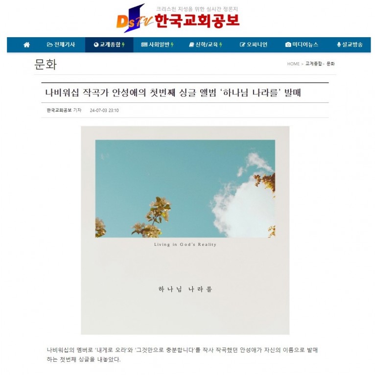 뮤직타임 [기사] 나비워십 작곡가 안성애의 첫번째 싱글 앨범 ‘하나님 나라를’ 발매(한국교회공보)