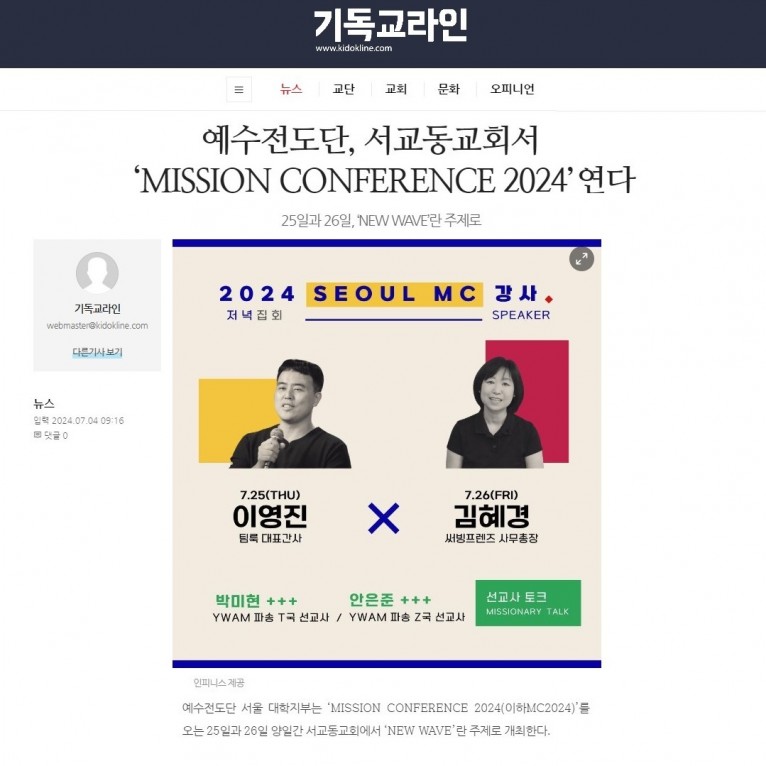 [기사] 예수전도단, 서교동교회서 ‘MISSION CONFERENCE 2024’ 연다(기독교라인)