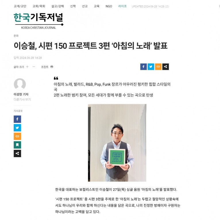 뮤직타임 [기사] 이승철, 시편 150 프로젝트 3편 ‘아침의 노래’ 발표(한국기독저널)