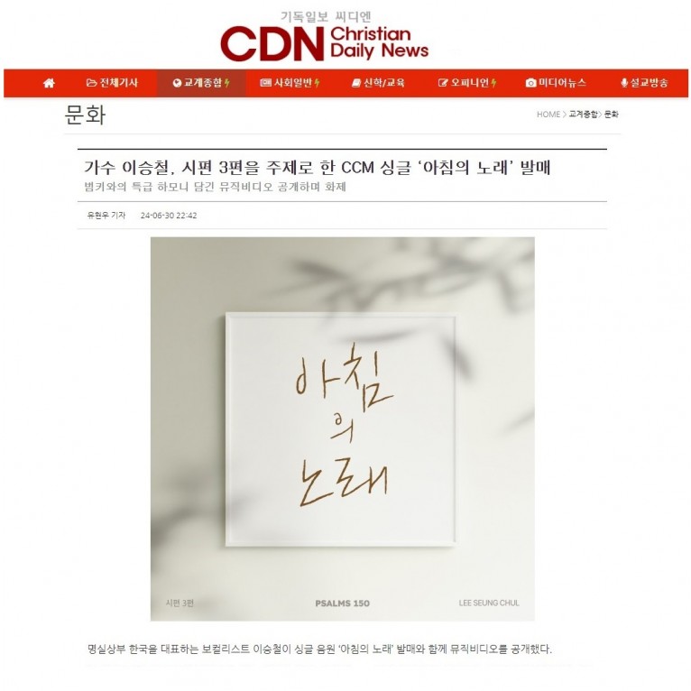 [기사] 가수 이승철, 시편 3편을 주제로 한 CCM 싱글 ‘아침의 노래’ 발매(기독일보 씨디엔)