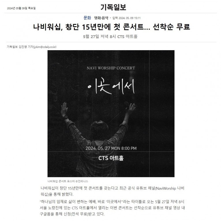 “하나님의 임재로 삶이 변하는 예배, 바로 ‘이곳에서’”라는 타이틀로 오는 5월 27일 저녁 8시 서울 노량진에 있는 CTS 아트홀에서 열리는 이번 콘서트는 선착순으로 유튜브 채널 영상 내 구글폼을 통해 신청(전석 무료)받고 있다.