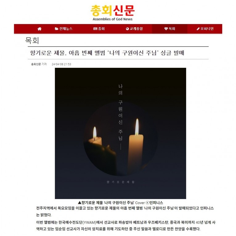 [기사] 향기로운 제물, 아홉 번째 앨범 ‘나의 구원이신 주님’ 싱글 발매(총회신문)