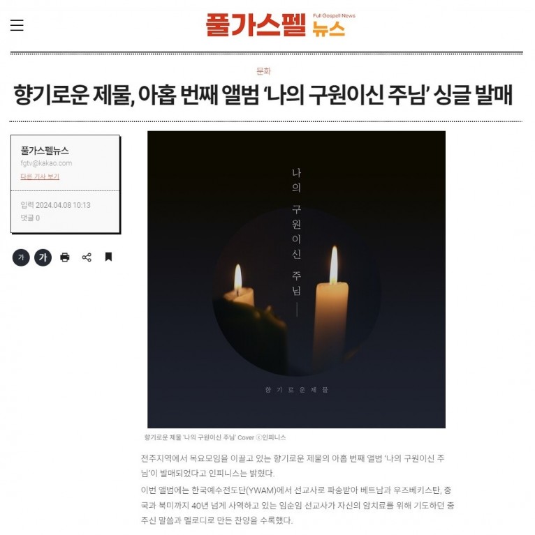 뮤직타임 [기사] 향기로운 제물, 아홉 번째 앨범 ‘나의 구원이신 주님’ 싱글 발매(풀가스펠뉴스)