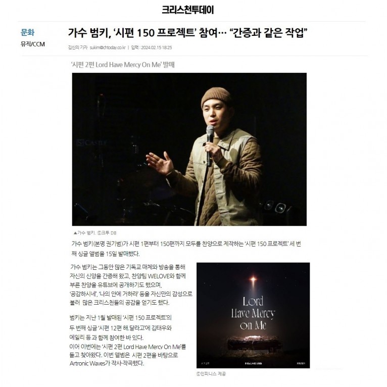 [기사] 가수 범키, ‘시편 150 프로젝트’ 참여… “간증과 같은 작업”(크리스천투데이)
