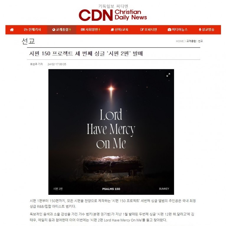 [기사] 시편 150 프로젝트 세 번째 싱글 ‘시편 2편’ 발매(기독일보 씨디엔)